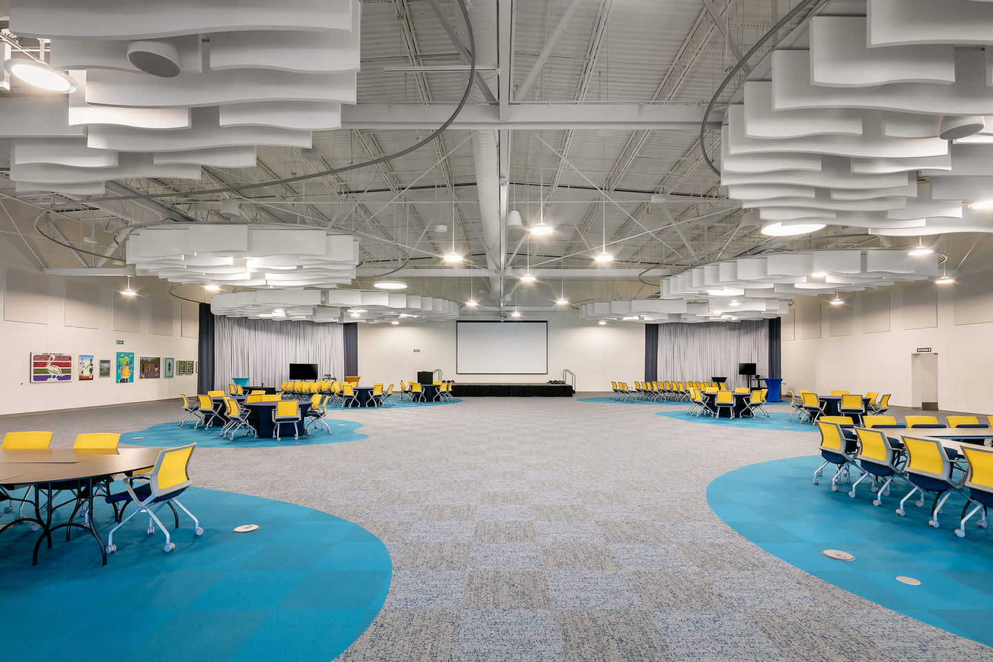 The architectural concept is closely tied to the client’s ethos which focuses on fostering unique solutions for health equity that come from within the community. Honest architecture with flexible spaces has driven the special planning of a clear visibility of all activities within the flexible spaces and several large infographics that explain the mission of the space. This concept of honest architecture with flexible spaces promotes the structural details and electric motors that allow the space to function to be clearly visible and celebrated portions of the details. The partitioning of the spaces was done by using 7-layer acoustic motorized curtains that allow a flexible and fluid space as opposed to the typical operable partition. The curtains in their stacked position also help reduce the reverberation time of the large open space.